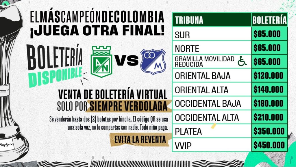 Por otro lado, Millonarios también ha agotado rápidamente su boletería para el partido decisivo en el estadio Nemesio Camacho El Campín de Bogotá el sábado 24 de junio a las 7:00 p.m. Los precios de las entradas oscilaron entre 49.000 y 429.000 pesos para el público en general, y todas las localidades se agotaron rápidamente.