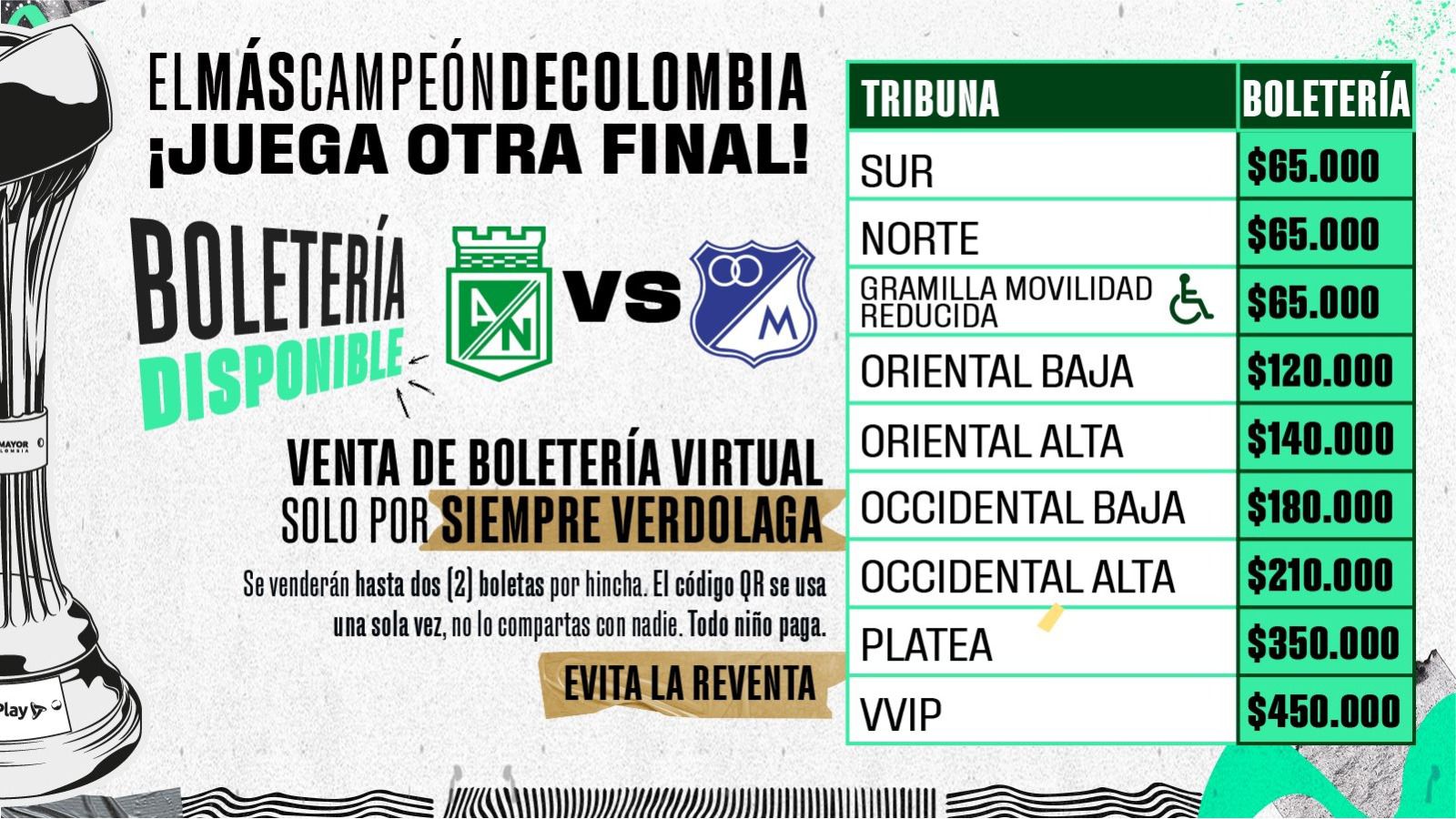Inicialmente, los abonados del Atlético Nacional tuvieron acceso prioritario a la compra de boletos hasta el lunes a las 11:59 p.m. A partir del martes a las 9:00 a.m., se liberaron las entradas para el público en general, los precios de los boletos para los abonados oscilaron entre $52.000 y $310.000, mientras que para el público en general variaron entre $65.000 y $450.000.