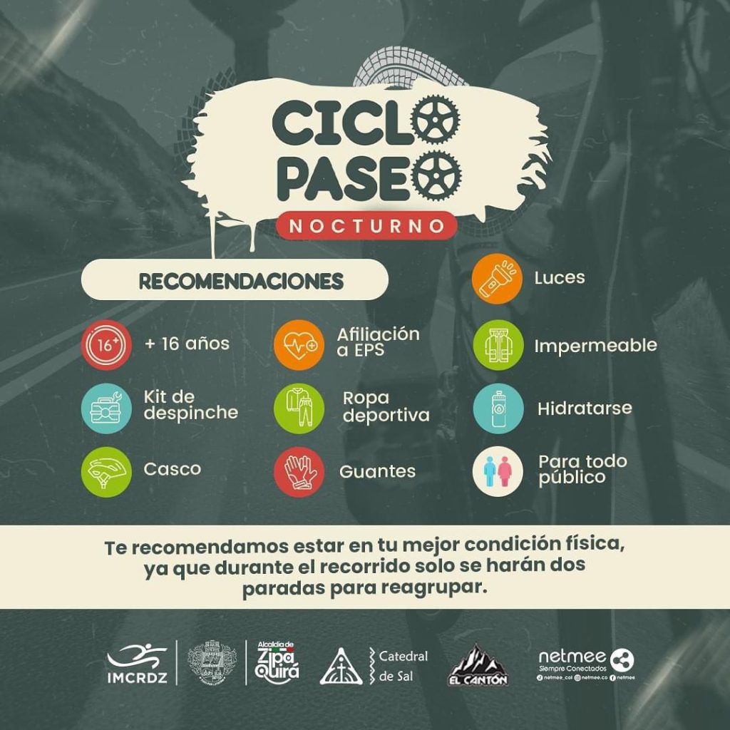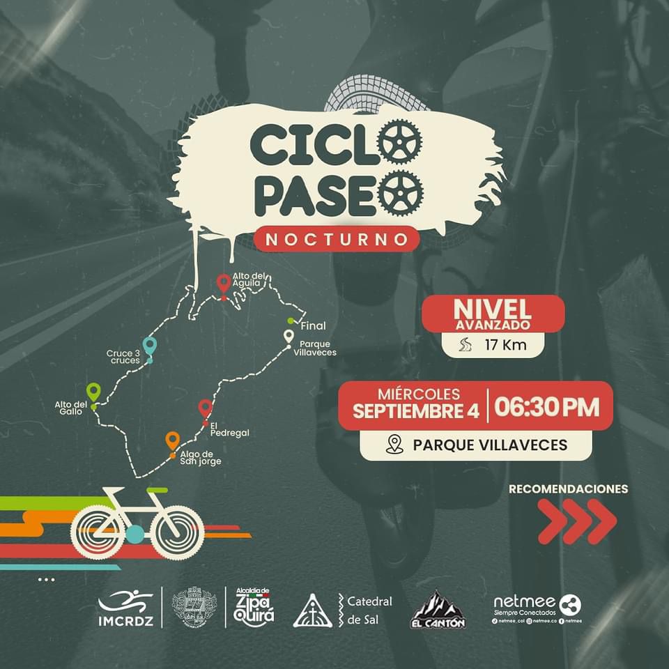 El Instituto Municipal para la Cultura, la Recreación y el Deporte de Zipaquirá (IMCRDZ) invita a todos los amantes del ciclismo a participar en el próximo Ciclopaseo Nocturno, que se llevará a cabo el miércoles 4 de septiembre. Esta vez, el recorrido será de un nivel avanzado, prometiendo un desafío emocionante para quienes disfrutan de rodar bajo las estrellas.