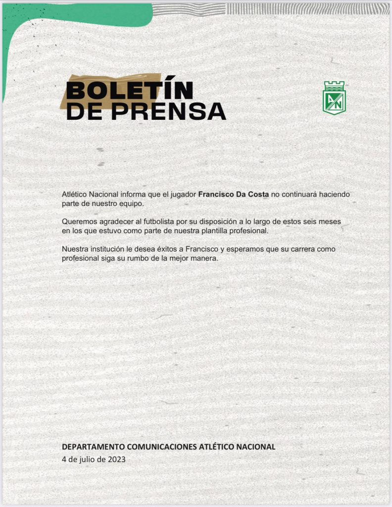 Atlético Nacional ha anunciado oficialmente la salida del delantero brasileño Francisco Da Costa debido a su bajo rendimiento en el equipo.