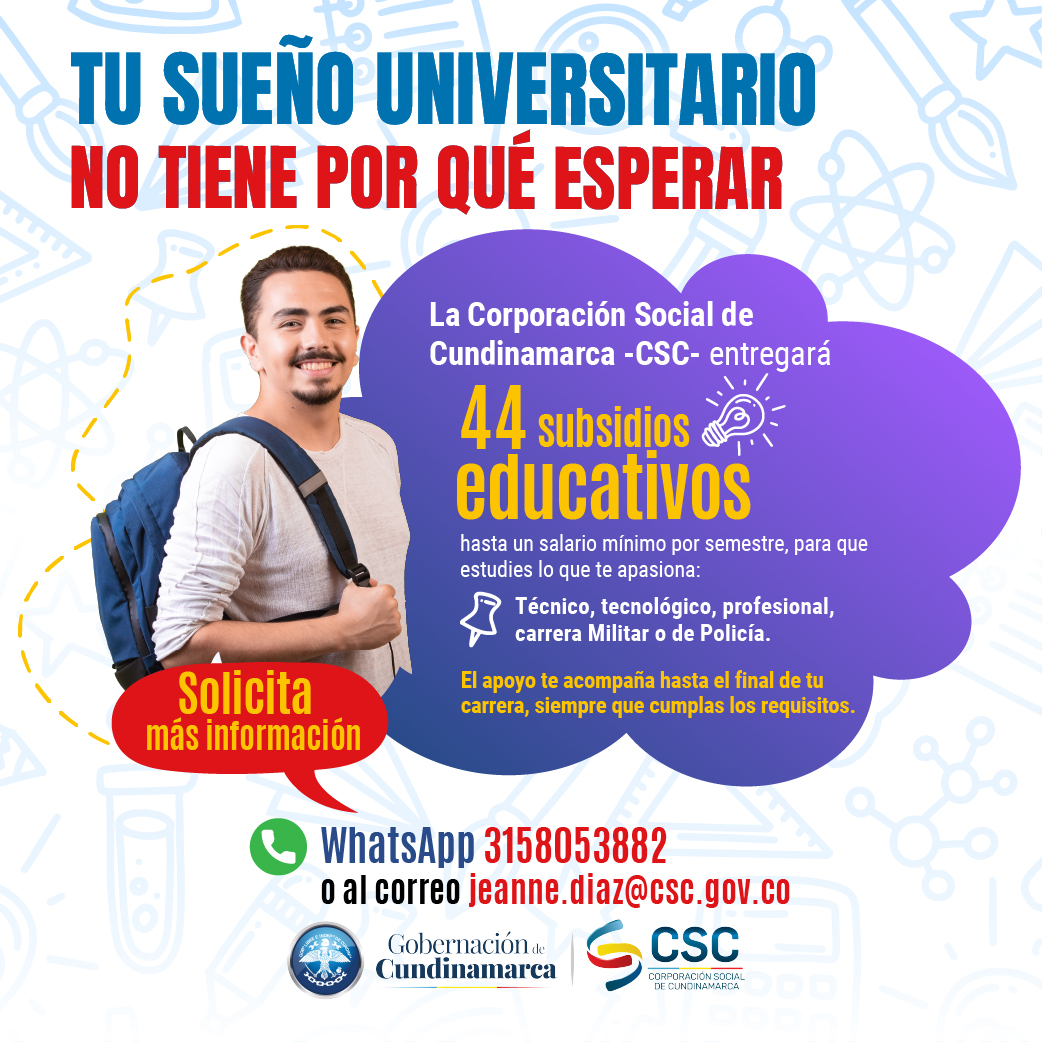 La Corporación Social de Cundinamarca (CSC), con el respaldo de la Gobernación de Cundinamarca, anunció la entrega de 44 subsidios educativos dirigidos a jóvenes del departamento que deseen iniciar o continuar sus estudios superiores. La iniciativa busca brindar apoyo económico para formación en programas técnicos, tecnológicos, profesionales, así como carreras militares o de policía.
