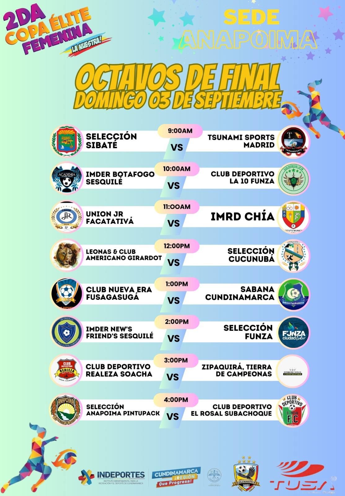 El equipo de fútbol femenino del Instituto Municipal de Recreación y Deportes de Chía logró clasificar a los octavos de final de la 2da Copa Élite, tras derrotar a Milán Cobra de Mosquera con un marcador de 6-1 en la fase de eliminación directa, convirtiéndose así en el único representante de la Chía en esta instancia del torneo.