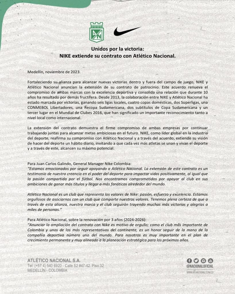 El presidente del club manifestó: «Anunciar la ampliación del contrato con Nike es motivo de orgullo; como el club más importante de Colombia y uno de los más representativos del continente, es un honor seguir de la mano de la compañía deportiva número uno del mundo.» Además, expresó su agradecimiento a Nike por su continuo respaldo y contribución a lo largo de estos años de colaboración.