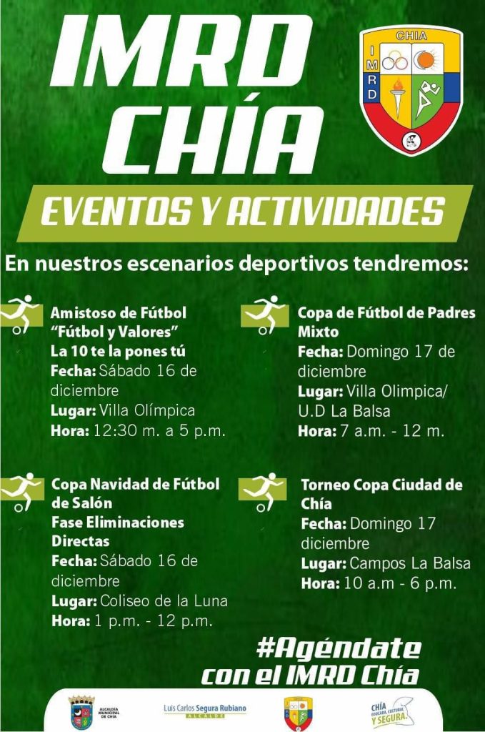 El Instituto Municipal de Recreación y Deporte de Chía (IMRD) presenta una agenda cargada para el próximo fin de semana del 16 y 17 de diciembre. La Ciudad de la Luna se llenará de acción con eventos en diversas disciplinas deportivas, destacando el fútbol en categorías menores y única, así como la emocionante Copa Navidad de Fútbol de Salón.