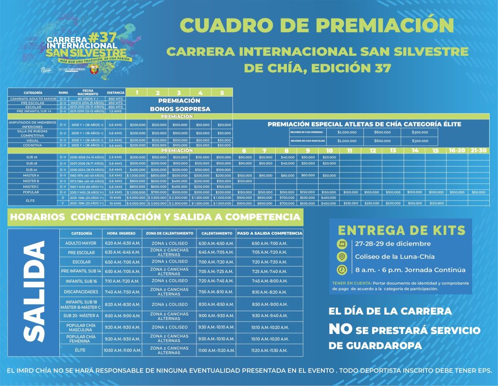 Se han destinado las fechas del 27, 28 y 29 de diciembre en un horario corrido de 8:00 a.m. a 6:00 p.m., para la entrega de los kits de competencia a los participantes, podrán reclamarlos en el Coliseo de la Luna, presentado el documento de identidad y el comprobante de pago de la inscripción.