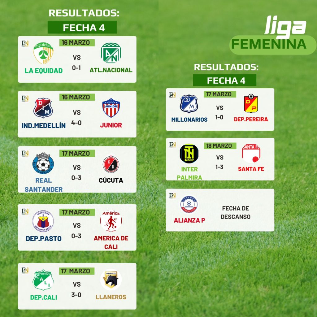 La emocionante jornada 4 de la Liga Femenina, que se disputó del 16 al 18 de marzo, dejó a los aficionados con grandes sorpresas y emociones. Independiente Medellín continúa demostrando su fortaleza al sorprender nuevamente al derrotar por 4-0 al Junior de Barranquilla, consolidándose en el primer lugar de la tabla con 10 puntos.