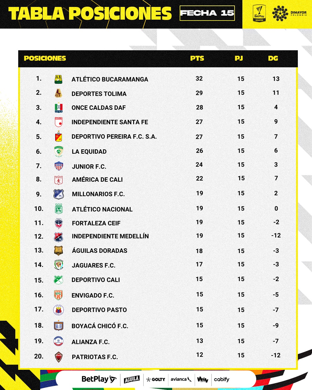Cerrando la tabla de posiciones está temporalmente Patriotas Boyacá con 12 unidades, el equipo boyacense actualmente también es ultimo en la tabla del promedio, allí en la lucha se encuentran Jaguares, Deportivo Cali, Envigado y Alianza FC, entre otros equipos comprometidos.