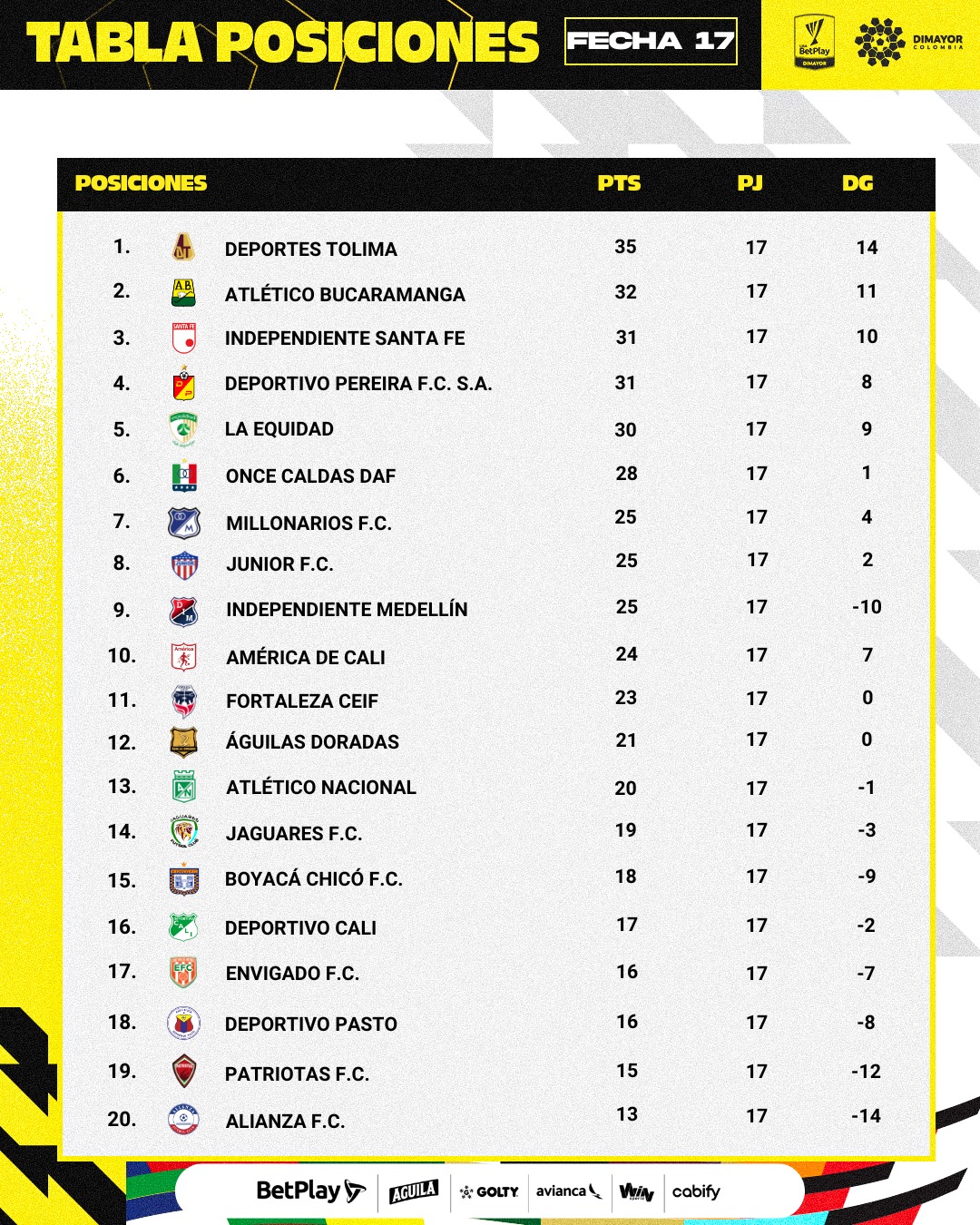 Deportes Tolima, Atlético Bucaramanga, Independiente Santa Fe, Deportivo Pereira y el Club Deportivo la Equidad ya han cumplido el objetivo, con los puntos alcanzados ya están asegurados en el selecto grupo de finalistas.